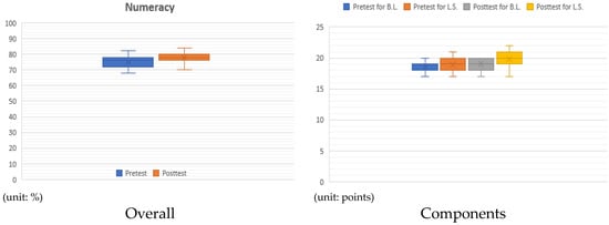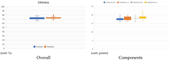 Improvement of pre-and post-education literacy as well as significance level need to be examined herein. Literacy is broken down into two areas: basic literacy and linguistic skill. The area that was identified as statistically significant before and after the education was linguistic skill. Literacy including the two areas was improved from 17.88 points before the education to 18.33 points after the education. Table 6 shows the paired t-test findings of literacy before and after the education. Figure 7 visualizes in box plots the differences between the pre-test average and the post-test average per area.
