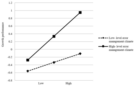 The moderating effect of different levels of error management climate was further examined. In the low group error management atmosphere (−1SD), the direct effect of proactive market orientation on financial performance and growth performance are no longer significant (confidence interval includes 0), and the effect sizes are 0.104 (LLCI = −0.056, ULCI = 0.264), 0.0720 (LLCI = −0.095, ULCI = 0.239). Under high error management climate (+1SD), the direct effect of proactive market orientation on financial performance and growth performance are still significant (confidence interval excluding 0), the effect sizes are 0.3669 (LLCI = 0.181, ULCI = 0.552) and 0.3529 (LLCI = 0.159, ULCI = 0.547). Figure 2 and Figure 3 show that both high and low error management climates have a positive predictive effect on the relationship between proactive market orientation, financial performance and growth performance, and the predictive effect of high error management climate is stronger than that of low error management climate.