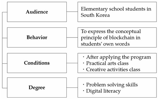 When designing the education program, we intended, firstly, to promote understanding of and interest in blockchain among the elementary students, and to foster talent for a sustainable future with quality education programs. To specifically state the objectives, we used the audience, behavior, condition, degree (ABCD) method, the objective statement of the Mager principles [19]. Figure 2 details the educational objectives specified in accordance with Mager’s [19] objective statement principles applied to this education program.