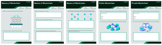 Thirdly, with regard to the selection of educational methods, media, and materials, we examined previous studies on the blockchain education program to analyze duplicated elements and define an educational method design strategy combined with lecture, experimental learning, gamification, problem-based learning, and simulations. Recognizing the significance of both unplugged worksheets and online-compatible worksheets for elementary school learners, we also developed worksheets usable even in remote lessons, using the Liveworksheets platform. Additional studies are needed to scale up the learning games proposed to be deployable, not only in offline classes, but also in online learning environments. Using the additional competencies of innovative emerging technological applications, such as blockchain, educators in the online and distance learning system, which has flourished with the use and support of the ICTs, should play a crucial role in terms of delivery instruction and interactive communication [35]. Within an educational context, blockchain can empower individual learners to manage and share details of their credentials without a trusted intermediary through an indisputable mechanism to verify that the data has existed at a moment [36].
