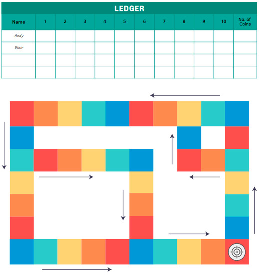 The second educational game designed was used in Lesson 2 to help the students understand the principle of a public blockchain. Each student starts with 50 coins. When the game is ready, every student chooses the color they want on the board. Students place their markers on the board in the color they choose. Students decide the order of the games by rock-paper-scissors. When the game starts, a player throws the dice in front of all players. Every student records every transaction on the ledger every time he/she throws the dice. The player throws the dice and moves the marker forward when the number comes out. He/she can throw the dice once more if the destination’s color is the same as the color of his/her choice. Double trading is possible in the next transaction. If the number of dice is odd, the player should pay coins to the other party, and if the number is even, he/she can take the other’s coins. The last remaining person will be the winner, or the person who has obtained the most coins in a set time will be the winner. If the player does not have coins, he/she can sell his/her slot to the other party, and the price is ten coins. It is important to note that all of these transactions must be recorded in their ledgers by all students.