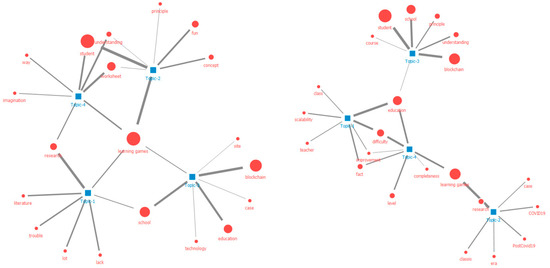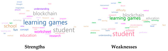 In the topic modeling of weaknesses, four topics were finally extracted. Unlike the strengths, several words were evenly distributed for the weaknesses rather than one dominant word. Firstly, Topic-1 comprised ‘education’, ‘difficulty’, ‘scalability’, ‘class’, and ‘improvement’, which indicates that the developed education program needs to be improved in terms of extensibility if it is to be used in classes. Topic-2 contained ‘research, ‘learning games’, ‘COVID19′, ‘Post-COVID19′, and ‘research’. Words related to COVID-19 appeared in this topic, indicating that studies utilizing learning games are ever more required in the post-COVID 19-era. Topic-3 included ‘student’, ‘school’, ‘principle’, ‘blockchain’, and ‘course’, etc., which suggests that the principles of blockchain covered in the education program are restricted. Lastly, Topic-4 included ‘education’, ‘level’, ‘completeness’, ‘difficulty’, and ‘improvement’. This indicates that the topic suggests that the level of difficulty needs to be added to the education program for completeness.