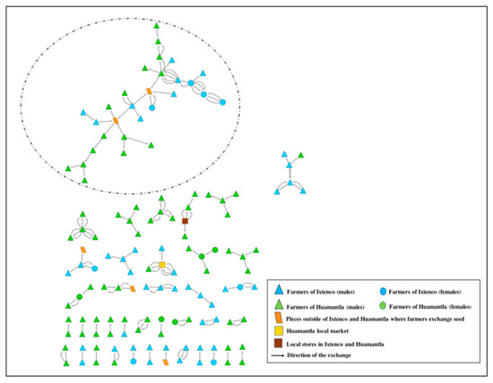 Figure 4 provides a close-up view of the principal module of the network, which includes 20.1% of the nodes, of which 12 are farmers from Ixtenco and 15 from Huamantla. In this principal module, farmers from Ixtenco and Huamantla had carried out seed exchanges with people from the municipality of Terrenate and the state of Puebla.