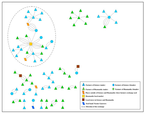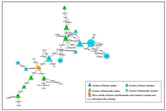 A graphic representation of the seed exchange network was constructed based on data from the surveys. Variables analyzed were number of maize, beans, and squash varieties that each farmer conserved, whether any of these varieties had been exchanged during the past five years, and if so with whom. These data served to determine the exchange network of each crop and to quantify the crop diversity that each farmer conserved (number of maize, bean, and squash varieties). We maintained in this research the local names of the native maize, beans and squash varieties. The majority of farmers of the two municipalities saved their own seeds every year to plant the following season, and therefore carried out few exchanges. For this reason, and due to the low frequency of exchanges each year mentioned by people interviewed, the decision was made to record the number of exchanges carried out by each farmer within the past five years (2015–2019). In order to provide a visual representation of the network, the open access program Cytoscape 3.7.1 was used [50,51]. The following data were employed for the SNA: farmer´s municipality, gender, varieties of maize, beans, and squash exchanged, social relationship with whom the exchange was carried out (family member, friend, neighbor, or acquaintance), and place of origin of the person with whom the exchange was carried out, and place of origin of the seed (e.g., local market, seed bank).