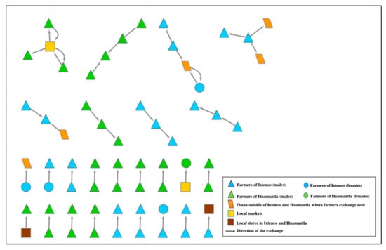 In recent years, SNA has been employed to evaluate management of agrobiodiversity [19,20]. These studies have allowed analyzing, visualizing, and measuring each node that forms part of a seed network [21,22,23,24,25], as well as identifying nodal farmers, those who are involved in a large number of exchanges of seed varieties [20,22,23,25,26,27].