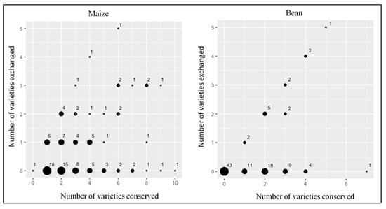 On average, each farmer conserves 3.17 ± 2.22 varieties of maize and 1.34 ± 1.46 varieties of beans. However, not all the maize, bean, and squash varieties a farmer conserves are exchanged; in other words, farmers are conserving more varieties than those they are exchanging for the maize, bean, and squash crops (Figure 9 and Table 9).
