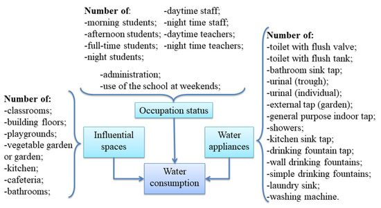 Influential variables for water consumption in buildings were addressed by Dias et al. [19]. Using a statistical model, this study found that water consumption increases with the age of the building and its distance to the city centre. Both size and occupation variables strongly influence water consumption. According to these findings, variables related to buildings rooms and spaces and occupational conditions were included in the model for assessing water consumption presented in this paper.