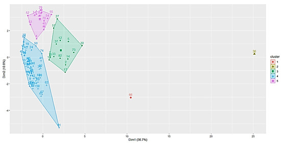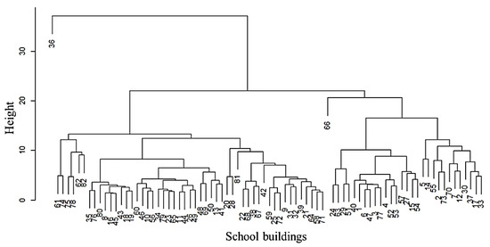 The number of clusters was defined to be used in the method of the k-means based on the visual analysis of the dendrogram shown in Figure 3. One can see 3 clusters, in addition to school buildings 36 and 66, at a linkage distance equal to 15 by Ward’s method. The formation of five clusters allows in-depth analysis in the benchmarking system following steps. With the clusters formed by buildings 36 and 66, five clusters were generated in total. The results of the k-means algorithm with five clusters are shown in Figure 5.