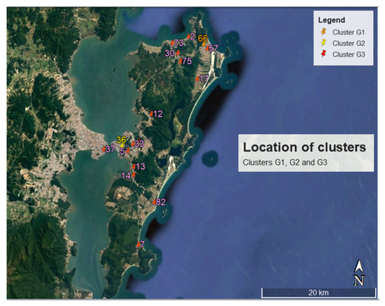As clusters G1 and G2 are composed of one building each, the geographic location of school buildings in clusters G1, G2 and G3 are shown all together in Figure 6. Cluster G3 presents only one school building in the continental region of Florianópolis.
