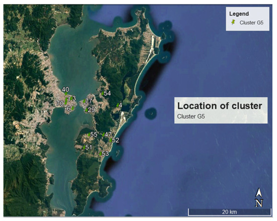 Cluster G5 has no representatives in the northern island region of the city and includes 15 school buildings distributed in the central portion of the island regions and continental region. Figure 8 shows the geographical distribution of school buildings in cluster G5.