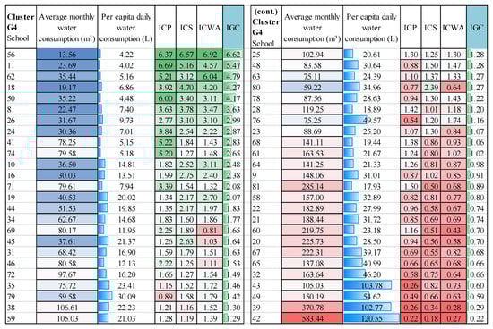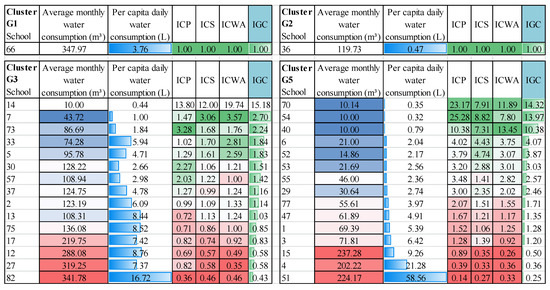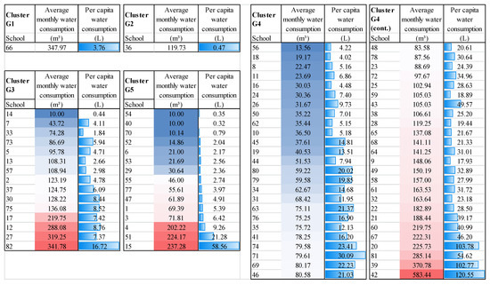 The first information extracted and analysed was water consumption, either the average monthly volume consumed in each building or the daily per capita water consumption. Figure 9 shows the rankings of water consumption within the clusters with the code numbers of each school building. Gradients from blue to red vary between school buildings with the lowest and highest monthly water consumption and the blue horizontal bars indicate the daily per capita water consumption. The cluster G4 is presented split into two.
