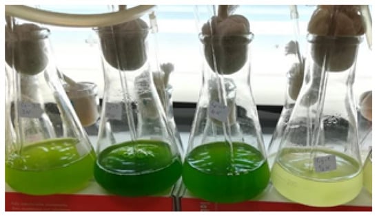 Among other things, it should be mentioned again that, according to recent studies, 1.88 kg of carbon dioxide is absorbed per 1 kg of biomass already produced [19,20]. The rate and quality of algae growth are strongly under influence the pH level. The optimum pH diapason for successful cultivation is 7–9. The pH is controlled directly by the CO concentration. Temperature is an equally important factor in algal productivity. It should be kept at 20–30 °C. Temperature is a very important factor, since going beyond the highest optimal value by only 2 degrees can lead to a complete loss of the crop.