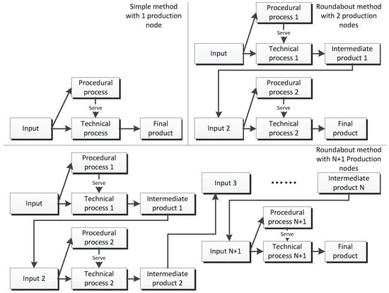 From the perspective of an enterprise production process, a roundabout production method refers to adding intermediate production tasks/steps before producing final products, as shown in Figure 1. Different from the existing literature, referring to the statement of Young (1928) [40], that “with the division of labor a group of complex processes is transformed in to a succession of simpler processes, some of which, at least, lend themselves to the use of machinery”, this study assumes that all production activities need only one production input to focus our attentions on the efficiency loss comes from ER. Viz., instead of nested hierarchies of tasks in Andersen (1996) [44]’s research, industrial productions can be abstracted as a kind of linear production chain includes many production nodes of intermediate products in a given production sequence determined by technologies, and one production node of final products. According to the roundabout production theory, with the development of technologies, the types of intermediate products, and the hierarchies of tasks in a roundabout, production tends to increase continuously [44], resulting in the emergence of externalities that are considered to be specialization through input diversification [43,46], so that the production efficiency of downstream intermediate products and final products can be improved. Therefore, the hierarchies of tasks (or production nodes of a linear production chain), procedural processes, and technical processes determine the PR within any specific enterprise and thus the actual efficiency of the whole economy. Given the output, the types of intermediate products and the hierarchies of a roundabout production gradually increase with the progress of science and technology, and the technical processes in each task of a roundabout production will also be shortened. However, under the “process accumulation effect”, procedural processes tend to be extended correspondingly to meet the diverse needs of people with the improvement of people’s material living standards. In this case, PR depends on the hierarchies of roundabout production and the combination of technical processes and procedural processes in all industries of a society. Whether it is the production of intermediate products or the production of final products, where there lies the combination of technical processes and procedural processes, they are all specific tasks/steps of enterprise productions. As long as production activities still remain in these steps, they can only be called “intermediate products” rather than final products. Therefore, the length of the linear production chain of all enterprises directly determines the proportion of intermediate products in total social products at a certain time point. That is, the PR of the whole society.