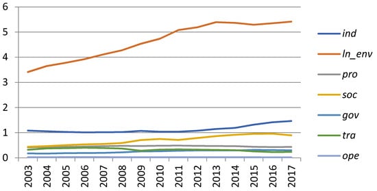 Since this paper is devoted to exploring the ISTU mechanism of ER in the whole society, and more samples could generally bring more robust econometric results [35,57,58,59,60], the panel data of 31 provinces, municipalities, and autonomous regions in China from 2003 to 2017 (in view of the completeness and availability of the data, excluding Hong Kong, Macao and Taiwan) are used for empirical analysis, which are all from China Statistical Yearbook, China Environmental Statistical Yearbook, China Science and Technology Statistical Yearbook, China Urban Statistical Yearbook, New China 60 Years Statistical Data Collection and National Bureau of Statistics. The missing data were supplemented by an interpolation method, and the descriptive statistics of each variable, which are all annual variables, used in this study are shown in Table 2. Furthermore, a line graph to visualize the evolution of variables over the period selected is shown in Figure 3.