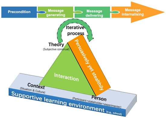 Rather than directly conveying ideas to participants who passively receive them, encouraging them actively to engage in an operation may be more effective in helping them to internalise the information [83]. Additionally, stealthy delivery enhances the validity of transformed messages [40,84]: Participants are less likely to reject ideas if “they do not feel controlling……they minimize resistance and reactance to the message” [40] (p. 284). This quiet and careful approach echoes the targeting of participants’ subjective construal of intervention [40], in that the forces that drive it are hard to see [85], and the negative stereotyping or social marginalization of participants is avoided [40]. This could also explain why a seemingly small intervention may produce a large effect [38].