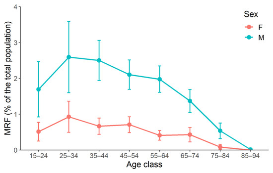 Participation in the general population reaches 12.52% (SE = 0.005) of men versus 3.66% (SE = 0.003) of women. Those aged 25–34 years old seem to constitute the most active MRF in both sexes declining in numbers as the age increases (Figure 2).