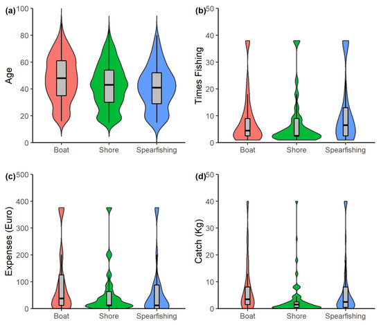 Box plots of the studied variables (a) Age, (b) Times of fishing, (c) Expenses, (d) Catches (kg/year) in relation to the modes of fishing in Greece (boat, shore, spearfishing). The colored shapes around the boxplots represent the distribution of the data around different values per fishing mode.