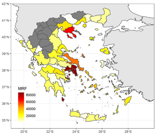 The total number of MRF in Greece was estimated to be 730,514 (SΕ = 0.004). This number corresponds to 7.93% of the total population of the country (within the ages of 15–89 years old). Considering the spatial distribution of MRF (Figure 1), insular areas and areas of the mainland with access to the sea, have a significant number of MRF. Notably, the islands of the Aegean depict a strong relationship (p < 0.01) with recreational fishing in comparison to the western region of the country and areas that have minimum or no access to sea which depict lower numbers. Large urban centers such Attica show 8% and Thessaloniki 10% participation rate, respectively.
