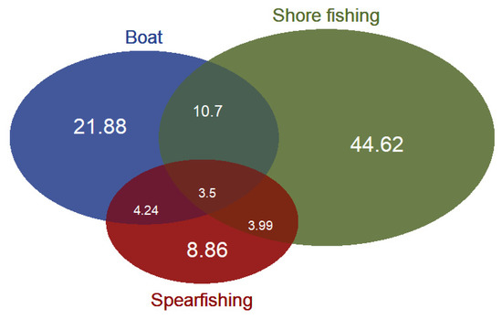 There are three fishing methods (modes) that are most common in the country (Figure 5). More specifically, at least once per year 44.62% (SE = 0.029) of MRF are fishing solely from the coast, 21.88% (SE = 0.024) are fishing exclusively by boat and a subgroup of 10.70% (SE = 0.018) is fishing by both modes. Only 8.86% (SE = 0.017) are exclusively spearfishers, but together with the overlapping subgroups spearfishing and boat 4.24% (SE = 0.001), spearfishing and coast 3.99% (SE = 0.011), all types of fishing 3.50% (SE = 0.01), they exceed 20% of the MRF in the country. Nevertheless, spearfishing is considered as a third pole of MRF, since the aggregate sum of MRF by boat and from the shore is exceeding 65% of the total MRF. A small percentage (2.21%) is using other methods of fishing.