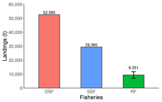 On average an MRF catch is 12.80 kg/year (SE = 1.10); this adds up to 9350.6 t/year. As shown in Figure 6 this amounts to almost one third (31.6%) of the small scale fishery landings (29,360.5 t), 17.7% of the open sea fishery landings (52,559.5 t) and 11.35% compared to the total commercial fleet landings (81,920 t), the same year of the study [23]).