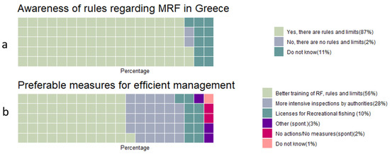 Waffle charts: (a) Percentage of awareness regarding rules and limits for the Greek recreational fisheries (b) MRF’s suggested measure rate, for efficient management of recreational fishing in Greece.