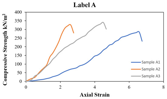 The experiment was carried out following British Standard (BS) 1377:1990 standards. The samples were sealed and labelled first before being kept in boxes. The boxes were sealed and stored in a moist curing room and left undisturbed for 7 days. In all samples, the percentage of HL was 2.5%, 4.5%, 6.25%, and 9%, and the PA was 0.75%; however, the sample with PA fibre and HL was cured for 7 days, whereas both control soil samples and the soil with fibre samples were only cured at 0 curing days. The percentages were chosen based on the research description. Furthermore, the sample had a diameter of 0.1044 m and a cross-section of 0.008 m2. Sample A is GRS only instead of label A, indicating that this is a result of the UCS of the control sample. Three specimens were taken from sample A, namely specimens A1, A2, and A3. From the compaction result, the water content used was 13.5% and the UCS result for 0 curing days shows that sample label A3 reaches 341 kN/m2, which is the maximum value when compared with samples label A1 (285 kN/m2) and A2 (325 kN/m2), based on Figure 7. The average value is 317 kN/m2.