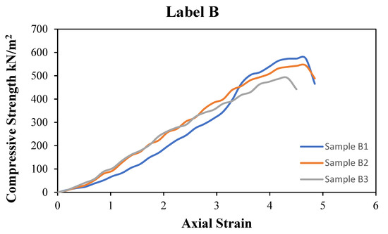 Figure 8 represents sample B. Sample B is a GRS mix with 0.75% PA fibre instead of label B, indicating that this is a result of the UCS of the GRS mix with 0.75% PA sample at 0 curing days. Three specimens were taken from sample B, namely specimens B1, B2, and B3. From Figure 8, the UCS result for 0 curing days shows that sample label B1 reaches 575 kN/m2, which is the highest value, while the sample for labels B2 and B3 reaches 545 kN/m2 and 491 kN/m2, respectively. The average value is 537 kN/m2.