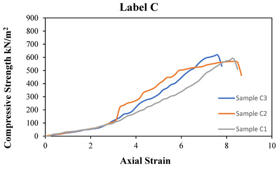 Figure 9 shows sample C. Sample C is a GRS mix with 2.5% HL and 0.75% PA fibre instead of label C, indicating that this is a result of the UCS of the GRS mix with 2.5% HL and 0.75% PA sample at 7 curing days. Three specimens were taken out from samples C, namely specimens C1, C2, and C3. From Figure 9, the UCS result for 7 curing days shows that sample label C3 reaches 615 kN/m2, which is the maximum value, while the sample for labels C1 and C2 reaches 589 kN/m2 and 569 kN/m2, respectively. The average value is 591 kN/m2.