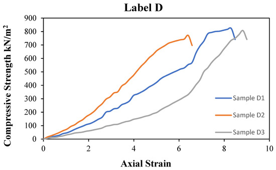 Figure 10 represents sample D. Sample D is a GRS mix with 4.5% HL and 0.75% PA fibre instead of label D, indicating that this is a result of the UCS of the GRS mix with 4.5% HL and 0.75% PA sample at 7 curing days. Three specimens were taken out from sample D, namely specimens D1, D2, and D3. The UCS result for 7 curing days shows that sample label D1 reaches the maximum value (823 kN/m2), while sample labels D2 and D3 reach 771 kN/m2 and 807 kN/m2, respectively. The average value is 800 kN/m2.