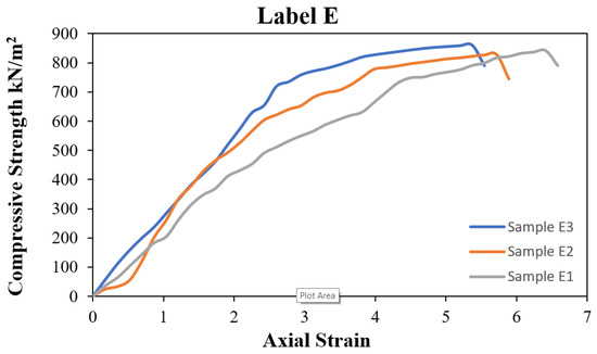 Figure 11 shows sample E. Sample E is a GRS mix with 6.25% HL and 0.75% PA fibre instead of label E, indicating that this is a result of the UCS of the GRS mix with 6.25% HL and 0.75% PA sample at 7 curing days. Three specimens were taken out from sample E, namely specimens E1, E2, and E3. From Figure 11, the UCS result for 7 curing days shows that sample label E3 reaches 861 kN/m2, which is the maximum value, while the sample for labels E1 and E2 reaches 842 kN/m2 and 827 kN/m2, respectively. The average value is 843 kN/m2.