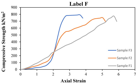 Figure 12 represents sample F. Sample F is a GRS mix with 9% HL and 0.75% PA fibre instead of label F, indicating that this is a result of the UCS of the GRS mix with 9% HL and 0.75% PA sample at 7 curing days. Three specimens were taken out from sample F, namely specimens F1, F2, and F3. The UCS result for 7 curing days shows that sample label F3 reaches the maximum value (792 kN/m2), while sample labels F1 and F2 reach 774 kN/m2 and 751 kN/m2, respectively. The average value is 772 kN/m2.