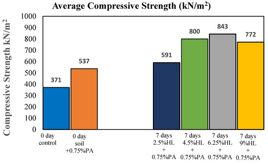 - The compressive strength was greatly improved by combining soil with HL and PA. The resulting UCS showed that 0 curing days increased strength by 31% while 7 curing days increased strength by 26% before decreasing the strength by 8.4% to 9%.