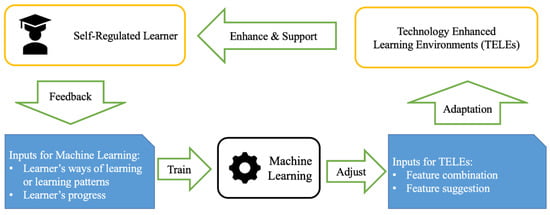 Furthermore, with the advances in ICT, machine learning (ML) techniques and algorithms enable TELEs to know individual learners’ ways of learning so as to adapt contents and supportive mechanisms in much diverse and personal manners. As illustrated in Figure 1, the role of ML in TELEs to support SRL may work in this way. SRL starts a learning process in TELEs by having learners use features offered by TELEs to self-study a certain learning task. The way the learners apply the facilities to their learning processes and the learners’ corresponding progress are then fed into ML components of TELEs for analysis and training ML to know more about the learners’ learning patterns. After the analysis, TELEs identify a combination of facilities and the usage frequencies of the features that might help the learners progress. TELEs use these types of information to know the learners’ learning patterns and then adjust themselves to suggest other features that the learners miss but should use to achieve better learning outcomes.