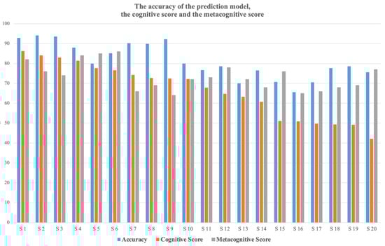 The bar chart in Figure 4 illustrates a correlation between the prediction model accuracy and the cognitive score and the metacognitive score of each participant in descending order according to cognitive scores. Overall, the students who earned the highest cognitive scores achieved prediction models with the highest accuracy and also had high metacognitive scores; however, those with the lowest cognitive scores also had high metacognitive scores.