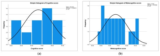 Table 2 and Figure 5 show results from the test and histograms for normal distribution over the collected data. Preliminary analysis showed the relationship to be linear with both cognitive score and metacognitive score normally distributed, as assessed by Shapiro–Wilk’s test (p > 0.05).