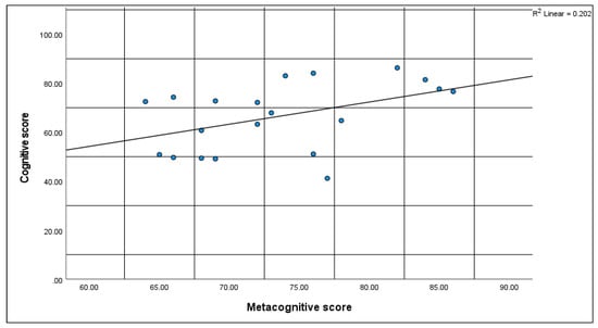 There was a statistically significant, moderate positive correlation between metacognitive score and cognitive score, r(18) = 0.449, p < 0.05, as shown in the test result in Table 3, with metacognition explaining 20% of the variation in cognition.