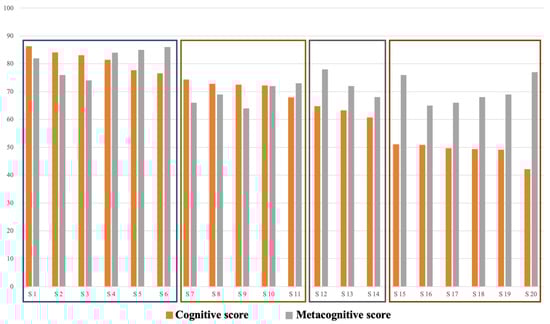 Processed data could be divided into four groups, as demonstrated in Figure 7. Group 1 includes students whose cognitive scores and metacognitive scores were the highest and positively corresponding. Next is Group 2, with Students 7, 8, 9, 10, and 11, whose cognitive and metacognitive scores were the second highest and positively correlated. Followed is Group 3, which includes Students 12, 13, and 14 whose metacognitive scores were higher but whose cognitive scores were lower than those in Group 2. Finally, Group 4, including Students 15, 16, 17, 18, 19, and 20, contains an apparent disagreement between cognitive and metacognitive scores.