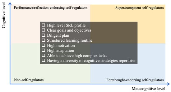 Understanding how the mind works, specifically how cognitive strategies perform and how to regulate those strategies in an academic context, is beneficial for improving learning [16] in general and improving SRL in particular. There are several studies about links between cognition and metacognition, mostly toward academic performance. Most of the studies agreed that the better the cognitive and metacognitive strategies are, the better the academic performance is [17,18]. As Winne [19] puts it, SRL is a complex intertwinement of cognition and metacognition. This relationship is difficult for learners to be aware of; even when recognizing such a relationship, learners often find it vague to identify its characteristics and quality in corresponding to the learners’ SRL levels. Thus, it would be informative and beneficial for learners’ understanding of their SRL profiles for them to have a checklist of characteristics from the relationship between cognition and metacognition, how effectively they self-regulate their learning and what appropriate improvement they should aim at. The experimental results in this paper seek to answer those points.