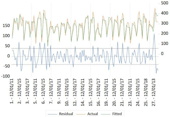 The correlation coefficient of the formed regression model is 0.82, and the adjusted R2 is 0.76. The provided model is placed in Figure 1.