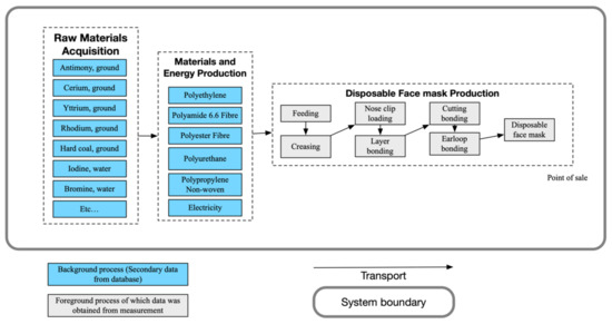 The main goal of this study is to evaluate the life cycle impact of disposable face masks to identify opportunities for environmental improvement in Indonesia. The system boundary covers stages from raw material acquisition and manufacturing production to the point of sale (Figure 1). This LCA study includes all direct and indirect resource use (elementary flows) and emissions. In the LCA, the term ‘functional unit’ (FU) refers to the primary function that the investigational items fulfil and the extent to which this function is considered. We adopted a pragmatic definition of the number of disposable face masks consumed by an individual in a month in this study (30 days). Daily usage of disposable face masks was assumed to be less than 12 h. This is a less restrictive scenario based on people in Indonesia who wear disposable facemasks while working, travelling, and shopping for an average of less than 12 h each day. As such, 1 FU corresponds to the use of 30 single-use disposable face masks.