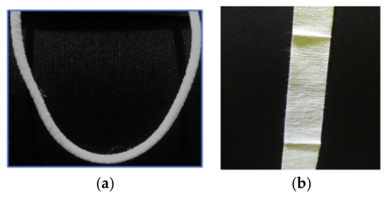According to the observations, the new design is effective for simplifying the manufacturing process, as it is possible to combine it with a layer bonding procedure, following nose clip loading. The process is one-way, requiring no additional work, nor the addition of new machinery. This is because the material utilised has a more polyester-like structure, which allows the machine for layer bonding to perform effectively, while also bonding the earloop. Additionally, polyesters exhibit a range of properties, including high strength and low extensibility (85 cN/tex and 7%, respectively) or low strength (26 cN/tex and 40%, respectively) [69]. Polyester’s mechanical flexibility lets it lower the amount of polyurethane (flexible foam) in the earloop, allowing the new design to function correctly. Figure 4 illustrates the change in the manufacturing process that occurred due to the modification in earloop design.