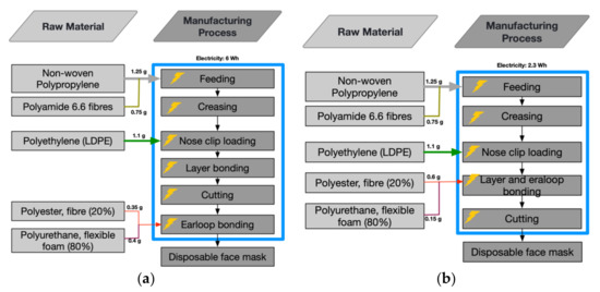 The material properties and the engineering design determine the filtration capacity and, thus, the protection level of disposable face masks. The raw material of disposable face masks consists of different polymeric materials that vary in their properties, such as polypropylene, polyurethane, polyacrylonitrile, polystyrene, polyethylene or polycarbonate, depending on the customers’ order [8,36,37]. However, among the plastic polymers that are acceptable as material for disposable face masks, polypropylene is the most frequently utilised due to its low cost and low melt viscosity for easy processing [38]. In other production processes, these specific polymeric materials are for plastic product manufacturing. Regardless of brand, face masks are typically formed by three layers of a thin non-woven textile: an outer waterproof layer to repel fluids, a middle filtering layer to prevent particles and pathogen-containing droplets from penetrating in either direction and an inner absorbent layer to trap user droplets [16,36]. Non-woven fabrics have better filtration efficiency and air permeability than woven cloth, with non-woven being less slippery [39]. The nonwoven fabric is formed by bonding a mass of filaments together through heat, chemical or mechanical processes (spun bond and melt blown techniques) to form smooth, porous and extremely durable sheets [40]. In some manufacturing processes, silica nanoparticles may be used as a filler to improve the material’s mechanical strength and toughness [41].