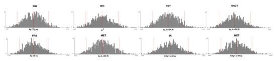 The study evaluates the environmental impact caused by the disposable face mask throughout the entire raw material acquisition process up to the point of sale. The impact assessment method used in this case is ReCiPe 2016 midpoint (H), which covers Eco-indicator 99 and CML, such that the impact analysis’ results are more comprehensive [62]. The midpoint results are more comprehensive in accounting for any environmental intervention [63] and more scientific analysis [64]. The purpose is to obtain a clear impact assessment. As uncertainty is prevalent [65], it is crucial to rely on non-predictable variables, such as a lack of precise information and natural environmental systems [66]. Therefore, Monte Carlo simulations need to be performed [50] to minimise the scenario’s uncertainty. The Monte Carlo simulation is used to establish the 95 percent confidence interval for the results of the cumulative LCI analysis. It would be misleading to report the LCIA results’ minimum and maximum values without considering LCIA uncertainty [55].