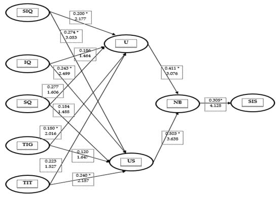 Modeling and the path diagrams of the inner model. Note: * = Sig 5% (* p < 0.05). Exogenous Construct: SIQ = System Information Quality; IQ = Information Quality; SQ = Service Quality; TIG = Trust in Government; TIT = Trust in Technology. Endogenous Construct: U = Usage; US = User Satisfaction; NB = Net Benefits; SIS = Sustainability Information Society.