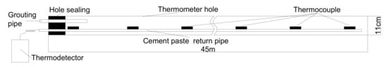 The measurement of the original rock temperature was performed in the Dongyi substation of Qujiang Mining Company. The drill hole diameter was 110 mm; the drilling hole was perpendicular to the surface of the chamber, the horizontal hole was designed with an elevation angle of 2 degrees, and the drilling depth was 45 m. After the hole was drilled and cleaned, the temperature sensors were installed in the hole. The temperature sensors were positioned 45 m, 40 m, 35 m, 30 m, 25 m, 20 m, 15 m, 10 m, 5 m, and 2 m from the orifice, as shown in Figure 1. Each temperature sensor was numbered at the outer end, and a PVC pipe with a diameter of 25 mm was used to transport and fix the temperature sensor in the temperature measurement hole. Each PVC pipe was 2 m long with quick connectors at both ends. After each temperature sensor was installed, we connected the thermometer in turn and checked whether the circuit was normal.