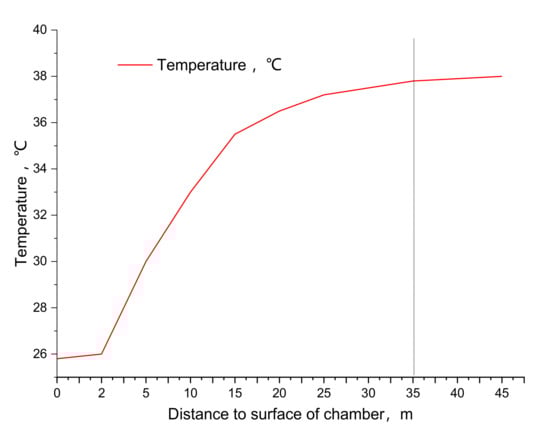 After the installation and debugging of the temperature sensor in the hole, the grouting pipe was inserted into the temperature measurement hole, and polyurethane was used to seal the hole for 1.5 m. After one day of polyurethane curing, the temperature measurement hole was filled by the grouting pipe with the grouting pressure of 2–3 MPa. The grouting material was cement slurry, and the water–cement ratio of the slurry was 1:1. We stopped grouting after the return of the grouting to the exit of the PVC pipe; then, we blocked the exit of the PVC pipe; then, we stopped grouting after 2 min of a steady pressure of grouting. Then, the temperature of each measuring point was measured to obtain the final temperature distribution in the surrounding rock of the substation chamber, as shown in Figure 2. The temperature measurement time was in summer, and the temperature at the entrance to the chamber was about 25 °C. As shown in Figure 2, it was determined that the control of Qujiang Coal Mine and the radius of the heat-regulating circle of the roadway was around 40 m.