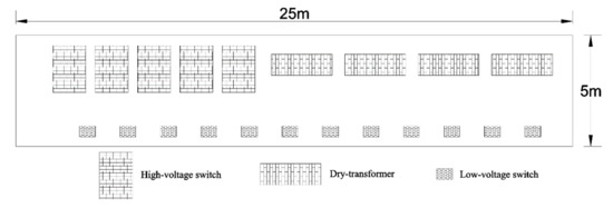 The underground Dongyi substation of Qujiang Mining Company is responsible for the power transformation and power supply of mechanical and electrical equipment in the eastern mining area of the Qujiang Coal Mine. The substation is located in the −850 East Lane of the mine, near the stone door of Dongyi. The surface elevation of Qujiang Company is about +37 m, the floor elevation of the substation is −850 m, and the actual buried depth of the substation is nearly 900 m. Currently, there are several pieces of equipment (4 dry-type transformers, 5 high-voltage distribution switches, and 12 low-voltage distribution switches) in the substation. Because the substation serves as a place for centralized distribution of voltage and current, the room temperature in the substation is stable above 28 °C, due to the high power of transformers and high-voltage switches. Especially because the temperature of the wellhead is high in summer, the highest temperature of poorly ventilated areas can reach up to 38 °C. Because the temperature of the working environment of transformers and high-voltage switches cannot exceed 40 °C, if the ambient temperature always exceeds 35 °C, it will accelerate the aging of the equipment and introduce instability, which will affect normal production. The actual equipment layout inside the substation chamber is shown in Figure 3, the cross-sectional dimensions of the substation chamber are shown in Figure 4, the equipment layout is shown in Figure 5, and the equipment model cross-section dimensions are shown in Table 1.