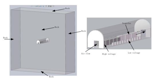 In order to find an economical and reasonable method to solve the problem of high temperature in the substation, a simulation study of the substation was performed by using the CFD simulation software AutoDesk. According to the data found in the previous literature and field measurements [25], the heat-regulating circle of the surrounding rock of the chamber was about 40 m away from the surface of the chamber, and therefore the size of the simulation model was finally determined as follows: width × height × length: 85 m × 85 m × 25 m. According to the situation of the site, the size of the front and rear air door of the chamber was determined as follows: width × height: 1.6 m × 2 m.