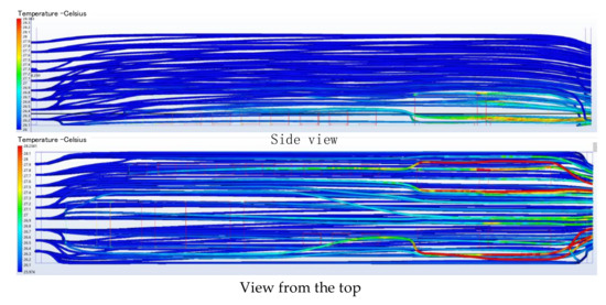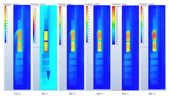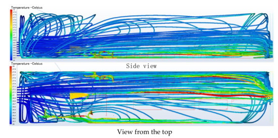 In order to further understand the cooling effect of ventilation in the chamber, a study of the wind flow path was conducted. The simulation results are shown in Figure 8.