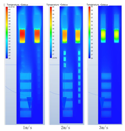 According to the simulation results and the size parameters of the field equipment and the chamber, the four transformers were changed to two on the left and two on the right, one working and one on standby on each side, and three low-voltage switches were moved to the side of the transformer. At the same time, the opening of the front and rear air door were increased to a width of 4 m and a height of 4.3 m with a straight wall arched door. Numerical simulation was performed for the rearranged substation chamber with an inlet air temperature of 26 °C and wind speed of 1 m, 2 m, and 3 m, respectively, as shown in Figure 9.